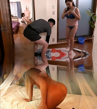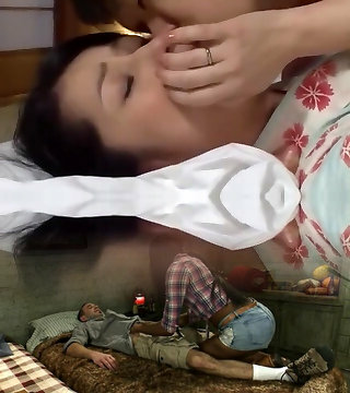 Stepson perverted his hairy Japanese stepmother to touch her small sweethearts and eat nipples