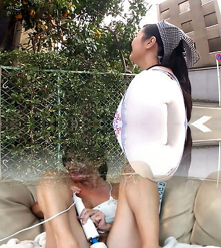 Chubby Asian mom with monster tits in outdoor threesome -